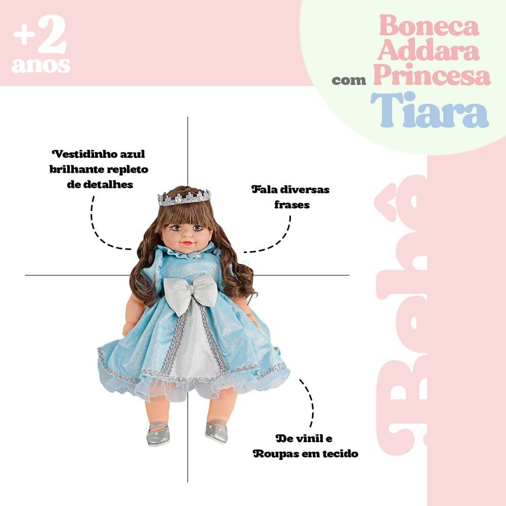 Com visual super fofo e encantador, a boneca Addara é muito mais do que uma boneca comum, ela é uma companheira interativa que fala diversas frases, trazendo ainda mais magia para as brincadeiras.Seu design possui um toque de charme e realismo, cativando o coração das crianças, com um vestidinho azul brilhante repleto de detalhes, uma tiara de princesa e um sapato que pode ser removido e lindos cabelos, ela é perfeita para conversas, histórias e aventuras. Com seu repertório de frases ela vai garantir ainda mais imersão no momento das brincadeiras, fazendo com que a brincadeira nunca acabe.Produzida com materiais de alta qualidade e um design encantador, a boneca é durável e segura, podendo brincar sem se preocupar com a integridade do brinquedo, além de ser a escolha perfeita para incentivar a imaginação e o desenvolvimento de habilidades sociais. -Não recomendado para crianças menores de 02 anos.-Funciona com bateria (já inclusa). ESPECIFICAÇÕES:Material: Vinil e Roupas em tecidoDimensões: Alt.: 50cm x Larg.: 30cm Peso: Aprox. 600g REGISTRO INMETRO: CE-BRI/IQB 4115 NM 300/2002 CONTÉM:01 BONECA ADDARA PRINCESA BLUE COM TIARA