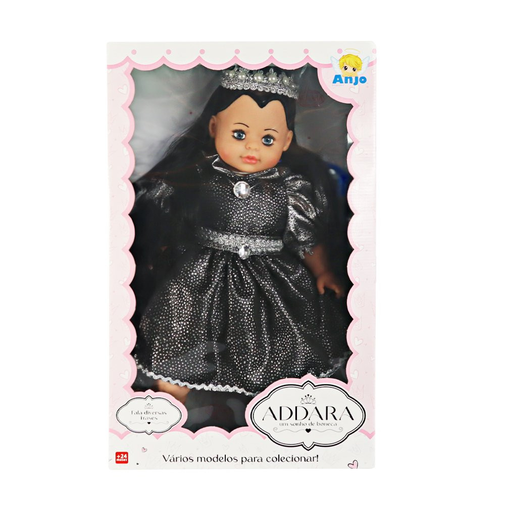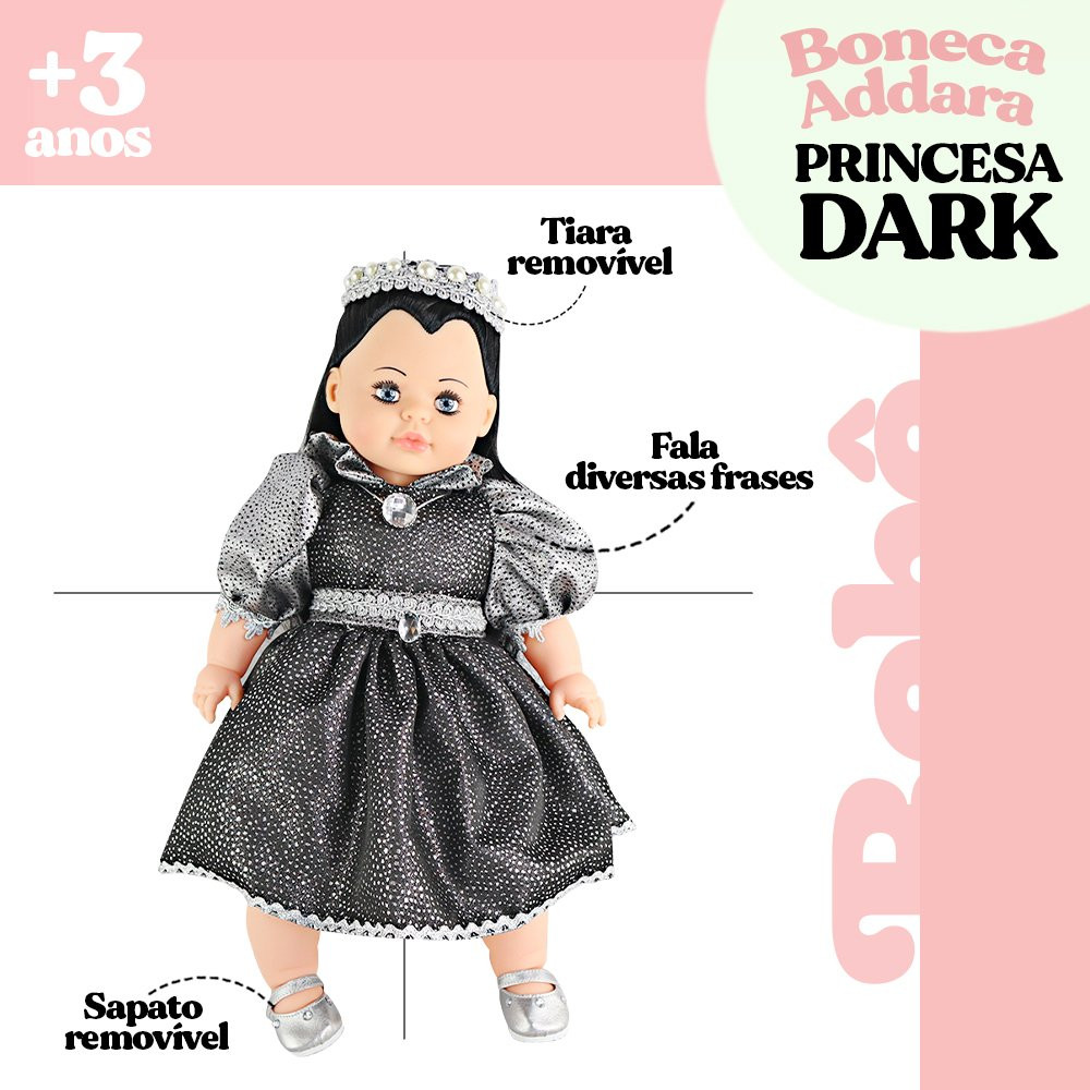 Com visual super fofo e encantador, a boneca Addara é muito mais do que uma boneca comum, ela é uma companheira interativa que fala diversas frases, trazendo ainda mais magia para as brincadeiras. Seu design possui um toque de charme e realismo, cativando o coração das crianças, com um vestidinho preto brilhante repleto de detalhes, uma tiara de princesa e um sapato que pode ser removido e lindos cabelos pretos, ela é perfeita para conversas, histórias e aventuras. Com seu repertório de frases ela vai garantir ainda mais imersão no momento das brincadeiras, fazendo com que a brincadeira nunca acabe. Produzida com materiais de alta qualidade e um design encantador, a boneca é durável e segura, podendo brincar sem se preocupar com a integridade do brinquedo, além de ser a escolha perfeita para incentivar a imaginação e o desenvolvimento de habilidades sociais. -Não recomendado para crianças menores de 02 anos. -Funciona com bateria (já inclusa). ESPECIFICAÇÕES: Material: Vinil e Roupas em tecido Dimensões: Alt.: 50cm x Larg.: 30cm Peso: Aprox. 600g REGISTRO INMETRO: CE-BRI/IQB 4115 NM 300/2002 CONTÉM: 01 BONECA ADDARA PRINCESA DARK COM TIARA