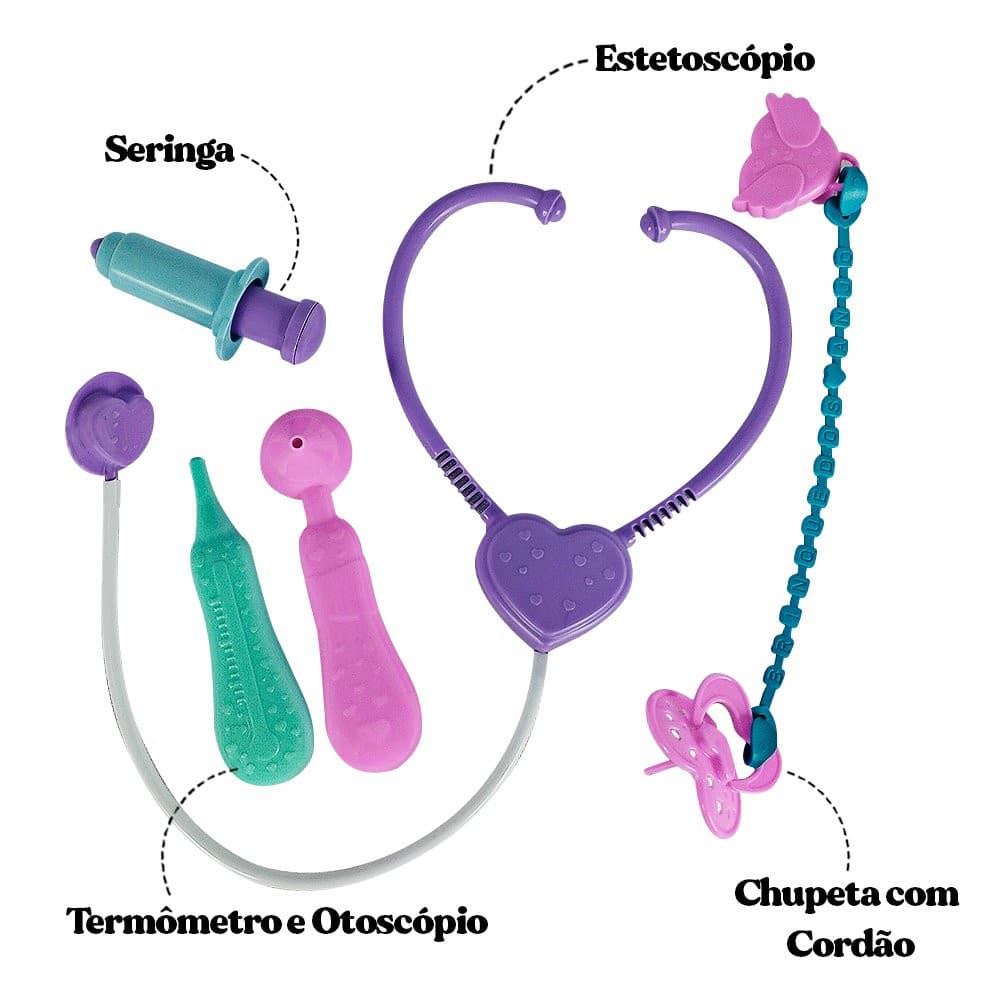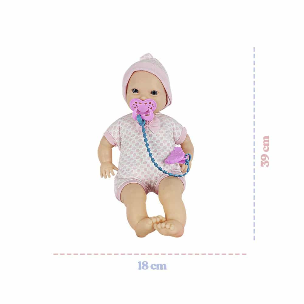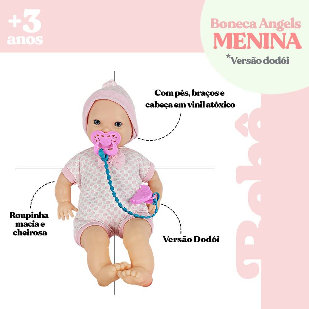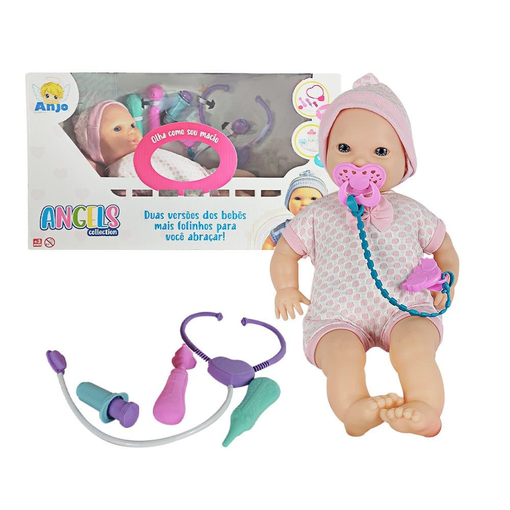Os Bebês da coleção Angels Collection são lindos! Com corpo de enchimento muito macio, foi desenvolvido para a criança abraçar e não largar mais! Com pés, braços e cabeça em vinil atóxico, macio e com um cheirinho delicioso, esse bebê vai encantar a todos. Além disso possuem lindos acessorios tudo para tornar sua brincadeira mais divertida, a criançada poderá soltar a imaginação e deixar a brincadeira muito mais agradável.Na versão dodói, acompanha uma linda chupeta com cordão e diversos acessórios médicos como estetoscópio, otoscópio, termômetro, seringa. -Não Recomendável para menores de 03 anos por conter partes pequenas que podem ser engolidas. ESPECIFICAÇÕES: Material: Polietileno, Vinil e Roupa em Tecido Dimensões: Alt.: 39cm x Larg.: 18cm Peso: Aprox. 379g A boneca conta com: 01 – Chupeta com cordão 01 – Estetoscópio 01 – Otoscópio 01 – Termômetro 01 – Seringa Registro Inmetro: CE-BRI/IQB 4115 NM 300/2002 Contém:B oneca Angels Collection Fofinha Menina Dodói