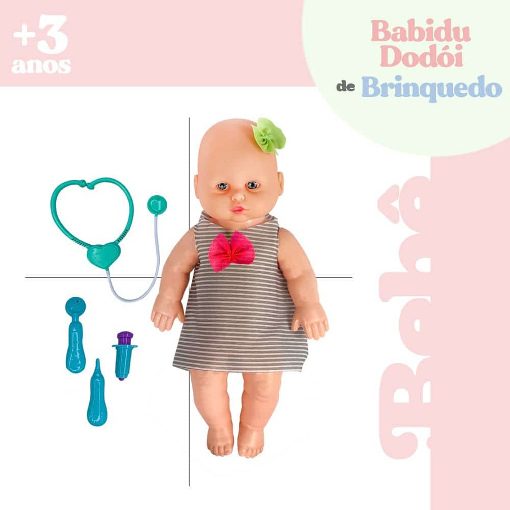 Esta boneca é a companheira perfeita para brincadeiras que ensinam cuidados e responsabilidades de uma forma divertida e envolvente.Com um design fofo, a boneca foi feita para que a criança tenha uma ótima imersão na hora da brincadeira com acessórios de medicina.As crianças vão adorar cuidar a boneca como se fosse um bebê de verdade, sendo uma maneira incrível de desenvolver habilidades de cuidado, empatia e imaginação enquanto se divertem. Além disso, conta com estetoscópio, termometro e otoscópio.Feita com materiais de alta qualidade, a boneca possui uma excelete durabilidade, perfeita para ser usada em muitas brincadeiras sem se preocupar com a integridade da boneca A boneca conta com:-01 Estetoscópio-01 Termometro-01 Otoscópio -Não recomendado para menos de 03 anos por conter partes pequenas que podem sem engolidas ou aspiradas.
