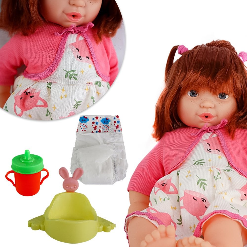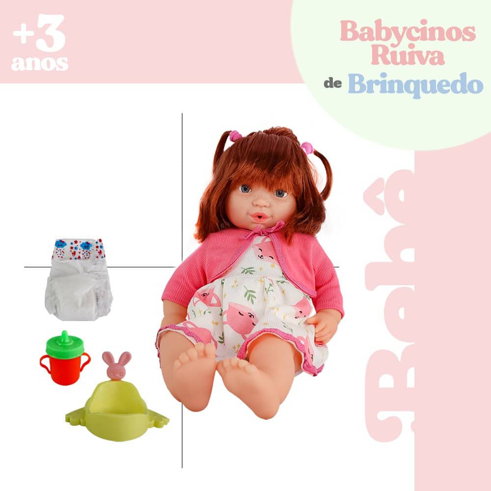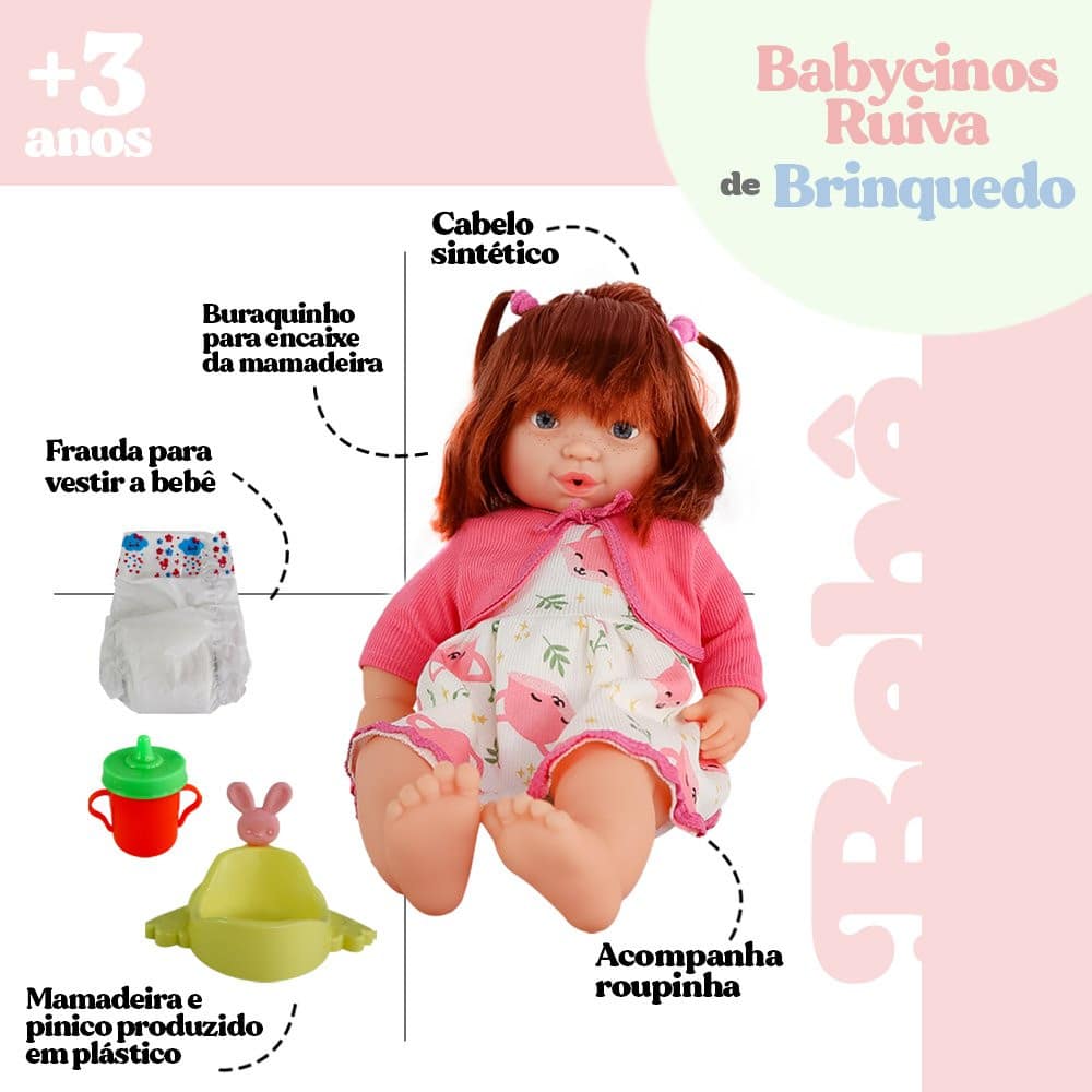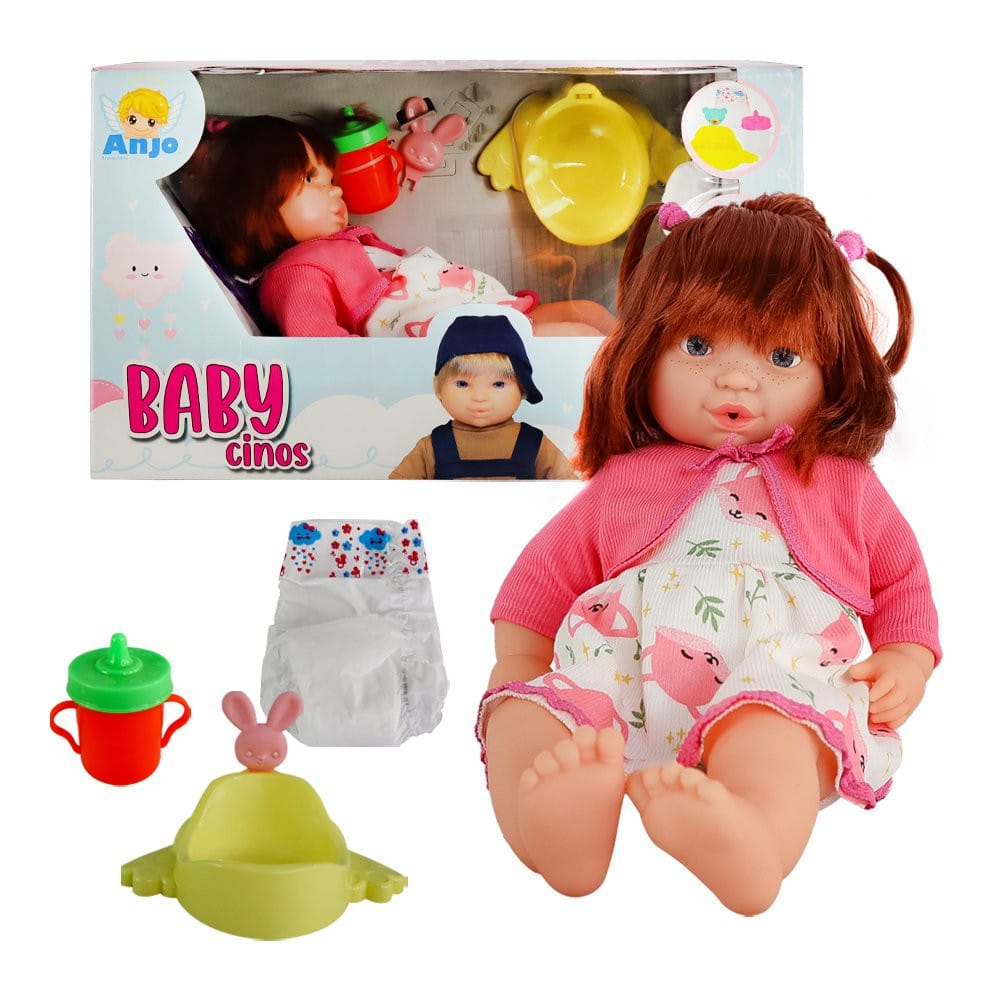 A Boneca Babycinos ruiva é a sua companheira mais fofa. Dê mamadeira para sua boneca, e ela faz xixi de verdade no peniquinho. Proporciona horas de diversão e entretenimento para sua criança. Com corpo de enchimento muito macio, foi desenvolvido para a criança abraçar e não largar mais! Com pés, braços e cabeça em vinil atóxico. Além disso possuem lindos acessórios tudo para tornar sua brincadeira mais divertida, a criançada poderá soltar a imaginação e deixar a brincadeira muito mais agradável. Acompanha uma mamadeira, uma fralda e um Pinico