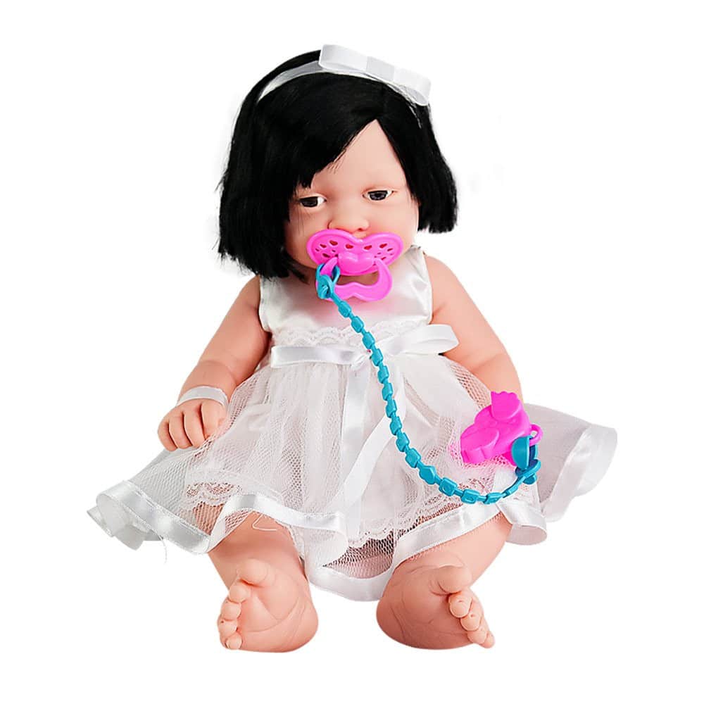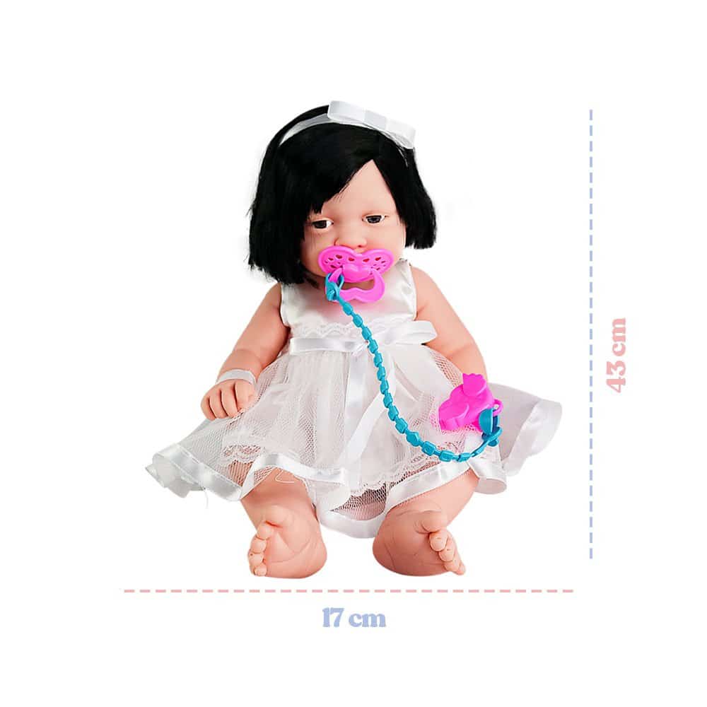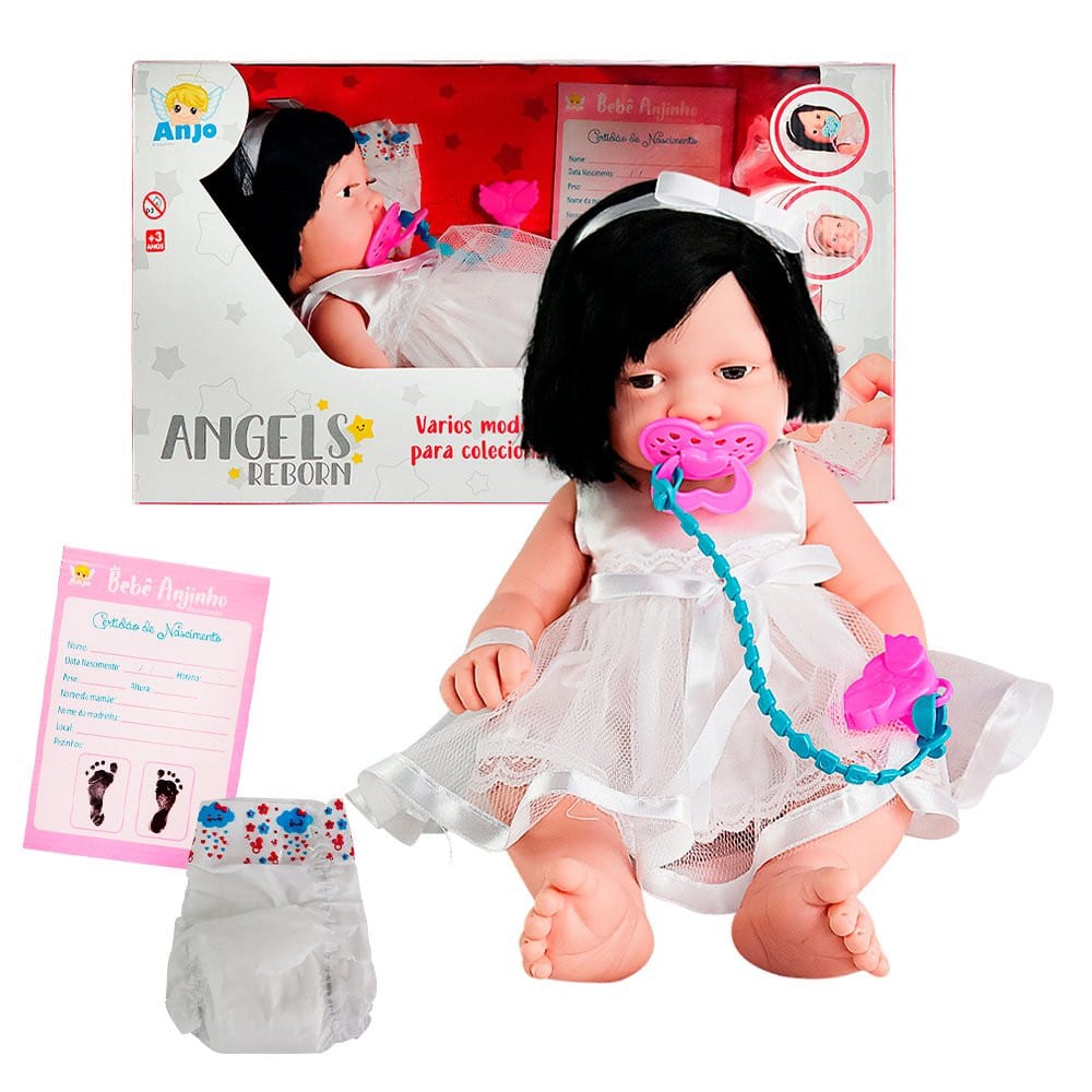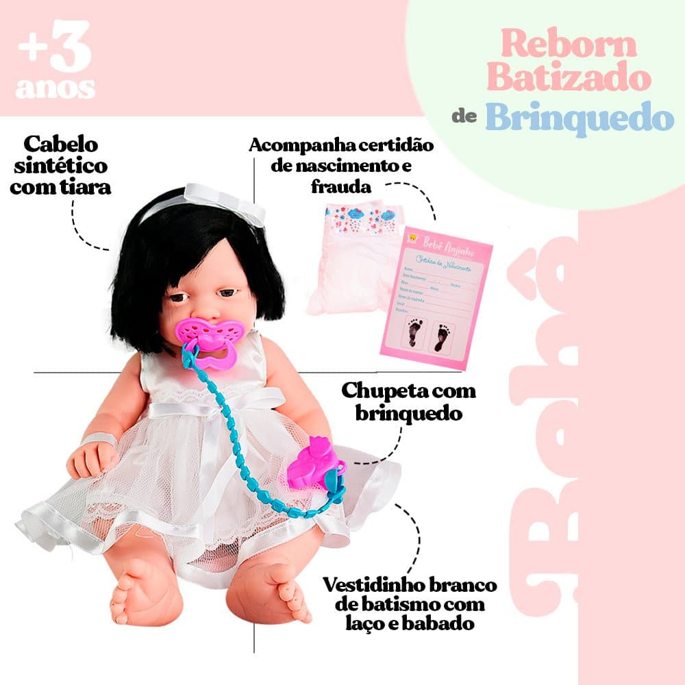 Boneca Bebê Reborn. Produzido em 100% em vinil atóxico muito macio, possui cabelos e olhos de vidro com cílios. Além disso possuem lindos acessórios tudo para tornar sua brincadeira mais divertida, a criançada poderá soltar a imaginação e deixar a brincadeira muito mais agradável. Na versão Batizado, ela vem com um lindo vestidinho branco cheio de detalhes, uma linda chupeta com cordão, uma fralda, pulseirinha de maternidade e certidão de nascimento. -Não Recomendável para menores de 03 anos por conter partes pequenas que podem ser engolidas. ESPECIFICAÇÕES: Material: Polietileno, Vinil e Roupa em Tecido Dimensões: Alt.: 43cm x Larg.: 17cm Peso: Aprox. 561g A boneca conta com: 01 – Chupeta com cordão 01 – Certidão de nascimento 01 – Fralda01 – Pulseirinha de maternidade Registro Inmetro: CE-BRI/IQB 4115 NM 300/2002 Contém: Boneca Bebê Reborn Batizado